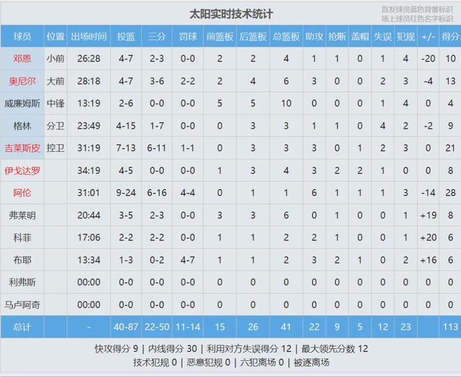 湖人替补仅得25分,太阳替补轰下56分,其中格雷森-阿伦独得28分6助攻,一个人摧毁了湖人板凳席。太阳榜眼杰伦-格林手感冰凉:投篮15中4,三分7中1,仅得9分3篮板1助攻1抢断4失误。最近4场比赛,格林三分球合计33中5!