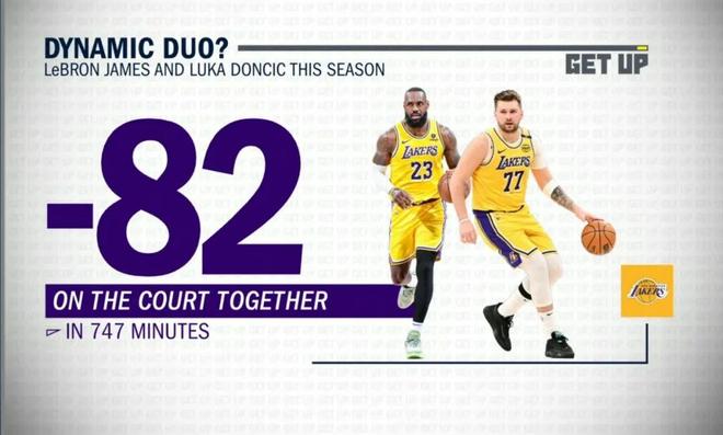 本赛季詹姆斯与东契奇747分钟同场时间里净负82分。