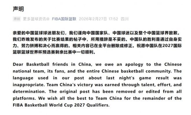 就在2月27日晚上7点,FIBA国际篮联官方发布了一则声明,强调因昨日中国男篮战胜日本男篮的比赛结果帖子中的措辞不当,向中国男篮、中国球迷以及整个中国篮球界致歉。