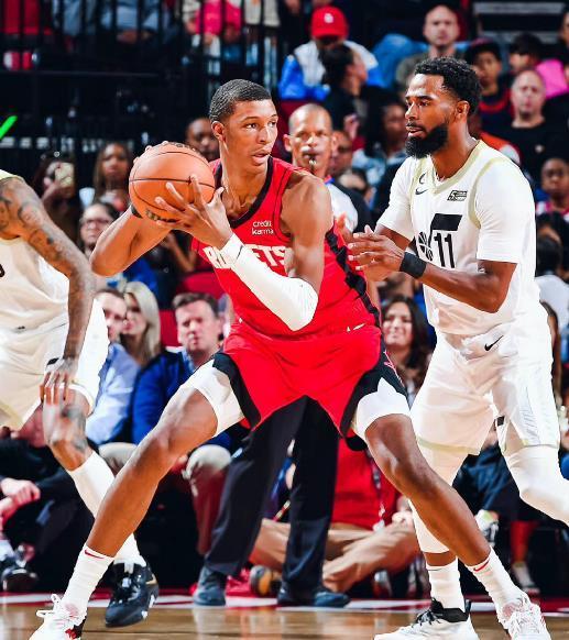 22岁的小贾巴里史密斯本赛季一直占据火箭队首发大前锋位置,他是申京在内线的最佳搭档,既能护框也能投三分、拉开空间,也是一位防守高手,还能为申京协防,是申京在内线的最好搭档。本场比赛小史密斯不在,阿门汤普森回到了大前锋位置上。但阿门汤普森的护框能力和身高没法跟小史密斯相比,因此申京在内线饱受冲击。他将更多的体能放在防守端,但是效果不佳。