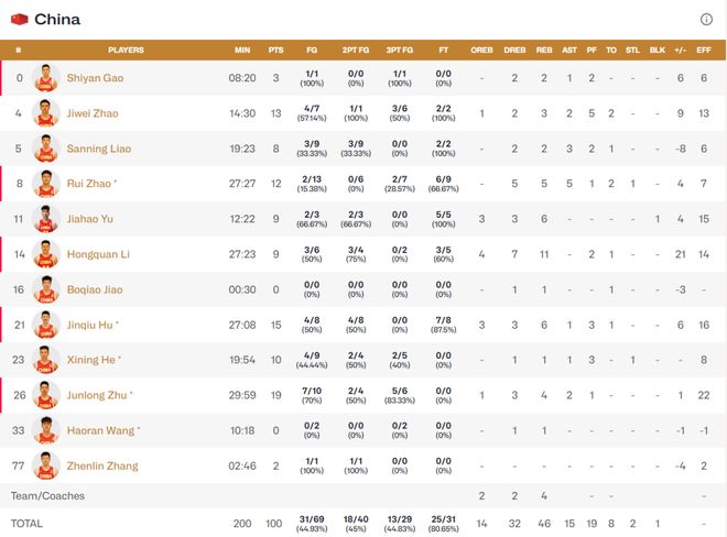 和上一场同日本的比赛一样,中国男篮再次体现出人多势众的优势,朱俊龙、胡金秋、赵继伟、赵睿、贺希宁5人得分上双,而第二次代表中国队出战的李弘权更成为篮板奇兵,一人抢下4攻7防11个篮板,率领全队在篮板球上以46比31大胜。而朱俊龙在三分线外6投5中砍下19分,带领全队打出44.83%的三分球命中率,压倒了同样手感火热、三分命中率高达40%的对手。