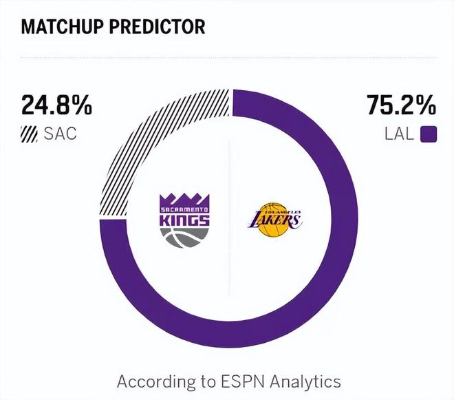 反观国王这边,上一场击败独行侠后,近3场比赛2胜1负,战绩14胜47负位列西部倒数第一。目前这支国王心思完全在摆烂上,小萨、拉文等核心全部赛季报销,球队以锻炼新人为主,不过威少倒是竞争意识不错,雷诺成为球队年轻球员中的佼佼者。赛前,ESPN预测此战的结果:湖人胜率高达75.2%,国王胜率低至24.8%