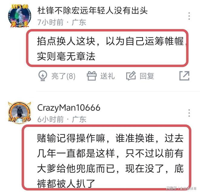 谁打得好换谁下,杜锋的临场调整,让粤迷们大惑不解,纷纷吐槽道“不是你的问题吗,你到底要怎么样才能下课,追到9分就把奶茶换下去,你到底在干什么?”;“而且萨姆纳刚进第一个三分,然后就换下去了”;“看的都绝望了,我直播间几百人在问为什么把奶茶换下去了,我丢 ,这他妈我也想不到啊,就跟怕赢了一样。”。