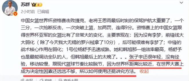 赛后名嘴苏群点评了比赛,从他的点评看还是信赖老将,大夸了王思雨,称她最后时刻起到了保驾护航太的重要作用。同时也表达了对新人——2.26米大个子张子宇的不信任。他说,“张子宇还很年轻,没有经验,移动较慢,跟现代篮球节奏比较脱节,因为世界杯距离比较近,在世界大赛上成为决定性因素还远远不够,所以如何使用还挺讲究方法。”苏群说的是张子宇移动慢,跟现代篮球节奏脱节,再一个就是张子宇暂时成不了世界大赛的决定性因素。也就是说张子宇在世界大赛起到的作用并不大,不给她过多的上场时间。
