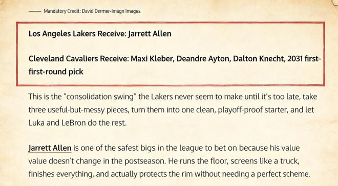 美媒《Fadeaway World》撰文提出了一套4换1的交易方案,建议湖人将克莱伯、艾顿、克内克特以及2031年的首轮签送到骑士,换回中锋阿伦。