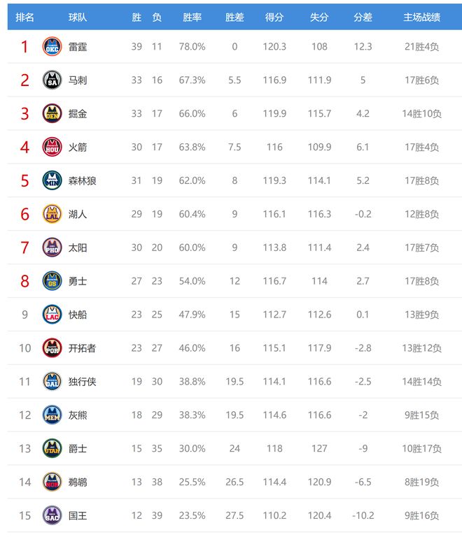 雷霆赢球后39胜11负排名联盟第一,掘金输球后33胜17负,排名从西部第二掉到第三,今日赢球的马刺成为第二。掘金、湖人、太阳今日都输球,给西部第四的火箭送上大礼,火箭和掘金的差距缩小到1.5个胜场,火箭领先湖人、太阳的优势来到1.5个胜场。