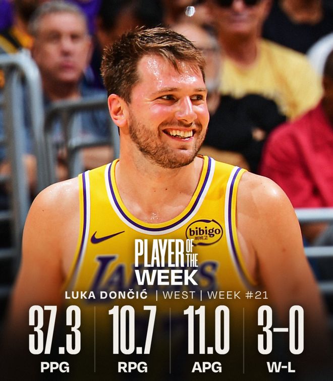 湖人后卫东契奇当选西部周最佳球员。这是他本赛季第3次获此殊荣,职业生涯第18次当选。