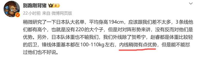 日前,日本篮协公布了世预赛的集训名单,对此媒体人别跑刚背猪发文表示:“日本平均身高1米94,和中国男篮差不太多,但中国男篮有内线优势。”