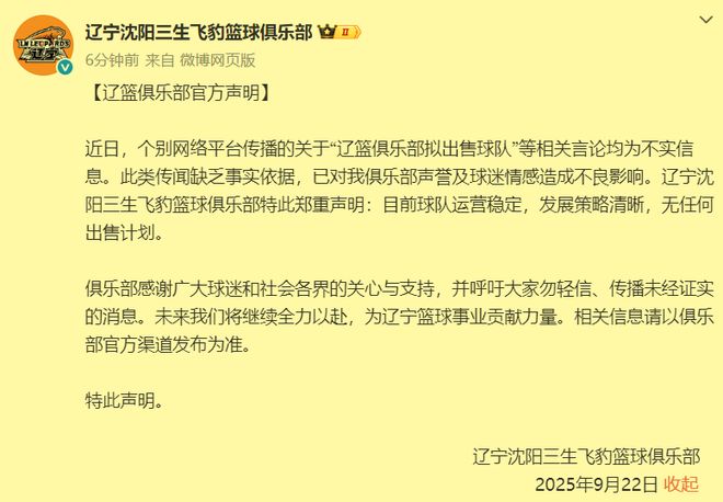 辽篮也已经正式辟谣了,明确说了坊间流传的辽篮将要易主的消息纯属胡说八道,是凭空捏造的谣言,但是俱乐部正在找新赞助的确是真的。