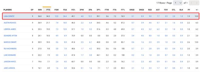 还有一项数据足以证明东契奇的作用,这9场比赛斯玛特正负值+104第一,东契奇在场+90湖人第二,里夫斯+57第三。