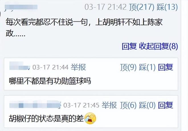 看到胡明轩这样的表现,再对比陈家政本场比赛的遭遇,也就不怪赛后有球迷替陈家政打抱不平了:每次看完都忍不住说一句,上胡明轩不如上陈家政。