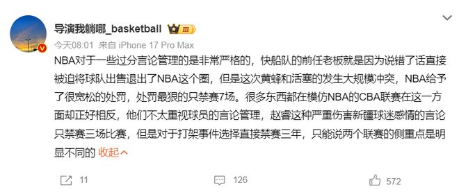 北京时间2月11日,CBA 公司终于对于赵睿的舆论风波给出了回应。此前北京首钢男篮国手赵睿在社交平台上发表了,针对新疆球迷的激烈言论引起了巨大的争议,最终CBA官方也给出了正面回应,开出重磅罚单停赛三场,罚款5万元,以示对于这件事的最终判决。但对于这个结果,很多球迷直言罚的太轻,而名记一针见血说出了问题。