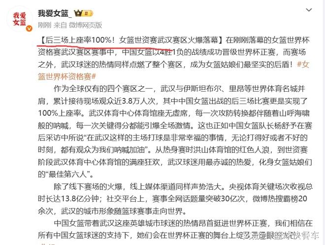由于是主场作战,中国队这一次也备受欢迎。根据知情人士透露,这一次女篮世预赛,中国赛区的比赛关注度非常高。这其中中国队更是成为了了流量大队。尤其是在后面三场关键战,中国队对阵南苏丹、捷克以及巴西三场比赛,中国队的上座率更是达到100%,现场可以说是座无虚席。不少人还因为买不到门票而感到郁闷。而在线上,关于中国女篮的话题,也热议不止。
