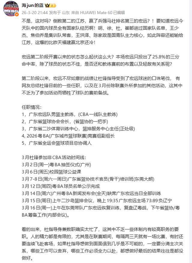 更深层的问题,是杜锋的精力分散。媒体人“海jun的蓝”披露,其身兼五职:广东宏远主教练、广东省篮协会长、二沙中心篮排服务中心主任、粤BA竞赛组副组长、省全运会篮球总协调人。仅三月,他便参与粤BA抽签、公益课、技术培训、新闻发布会等多场活动,甚至在3月14日缺席球队全天训练,次日即遭遇73-89负于辽宁。
