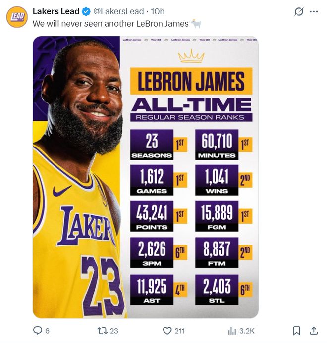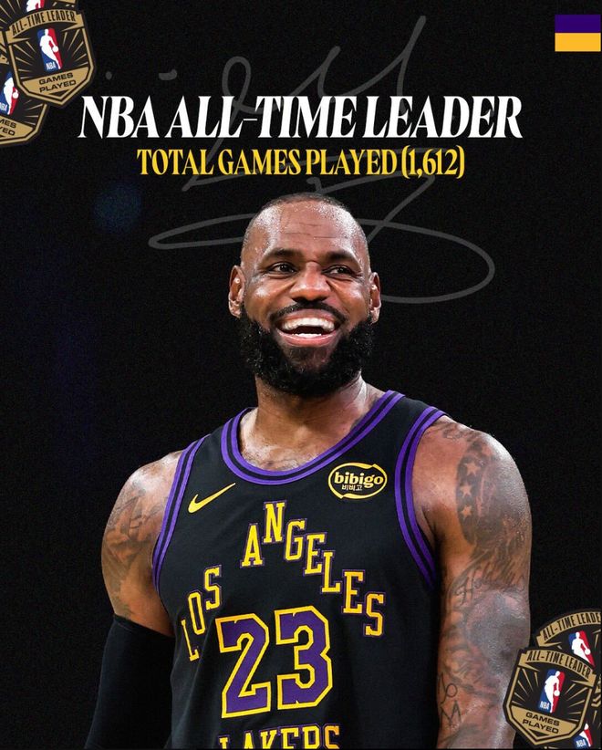 勒布朗-詹姆斯在对阵魔术的比赛中成为历史出场王(1612场)超越帕里什(1611场),这场比赛勒布朗拿到12分6篮板4助攻3抢断,虽然没有对阵此前的5场那么高效,可他依旧是湖人赢球的功臣之一。