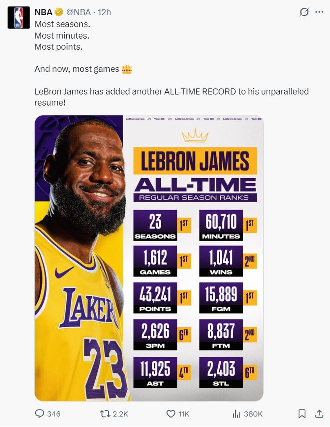 NBA官方还晒出勒布朗的一项海报写道:最多赛季、最多登场时间、最多得分、如今勒布朗登场数也是最多,他又为他无与伦比的职业生涯履历增添了一项历史纪录。戴上皇冠。