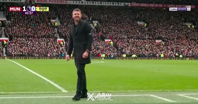 曼联面对少打一人的热刺,几分钟内就打破比分僵局,主要靠一个充满创意的角球配合。高中卫马奎尔在禁区内抢镜,作势要抢点吸引盯防,结果队长布鲁诺·费尔南德斯却把皮球传给跑到禁区边缘接应的科比·梅诺,后者回敲到弧顶位置,无人防守的姆贝莫巧射球门右下角入网。