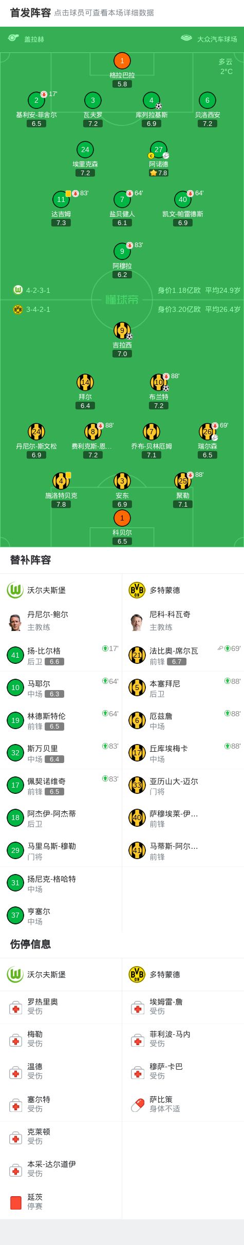 北京时间2月7日德国足球顶级联赛 联赛 第21轮,沃尔夫斯堡主场对阵多特蒙德。上半场瑞尔森开出角球,布兰特头球破门。下半场阿诺德开出任意球,库列拉基斯头球破门,比赛尾声恩梅加带球推进后传球,席尔瓦助攻吉拉西绝杀。最终多特2-1客胜沃尔夫斯堡。